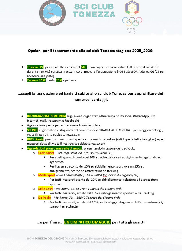 Sono aperte le ISCRIZIONI allo sci club Tonezza per la nuova stagione 2025 - 2026: clicca sul bottone sotto e procedi all'iscrizione